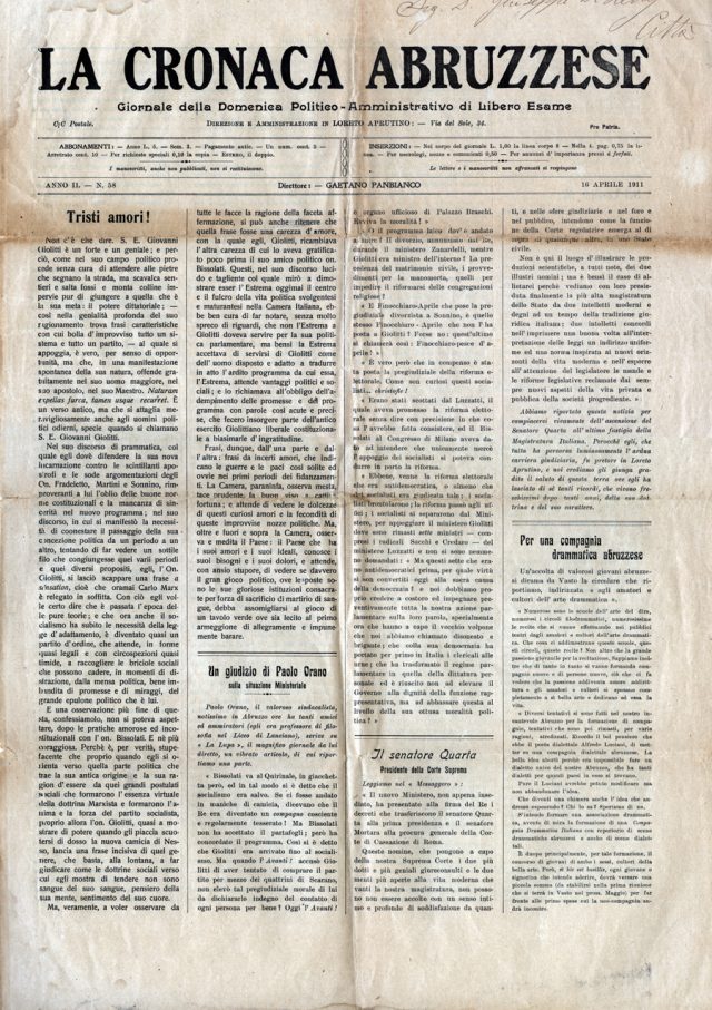 Ma di questa Patria, a cui tendono i nostri sentimenti d’amore, noi più caramente consideriamo quella parte ove i nostri padri ebbero culla e tomba, questo nostro superbo Abruzzo, grande di memorie antiche e di libertà, grande per scienze e per arti, grande per impulso di vita nuova che, fra le sue balze montane e i sussurri del suo mare, ne pervade tutte le fibre ringiovanite. Campanilismo? Oh no! Noi vogliamo che nel nostro Abruzzo siano curati e tutelati degnamente gl’interessi, siano riconosciuti tutti i giusti bisogni, sia incoraggiato e protetto il nuovo spirito d’iniziativa… Non tema alcuno che il nostro giornale sorga per essere giornale di lotta contro persone, giornale di ausilio contro persone: per noi uno il programma di lotta: lotta pel bene, lotta contro il male” La numerazione dei fascicoli è progressiva.